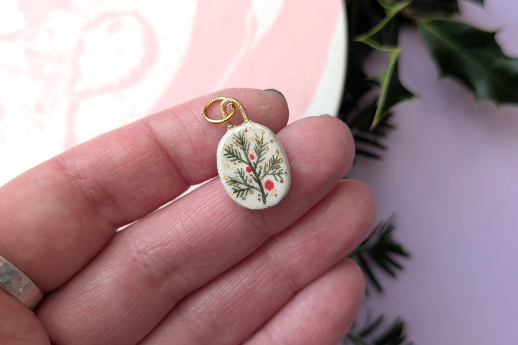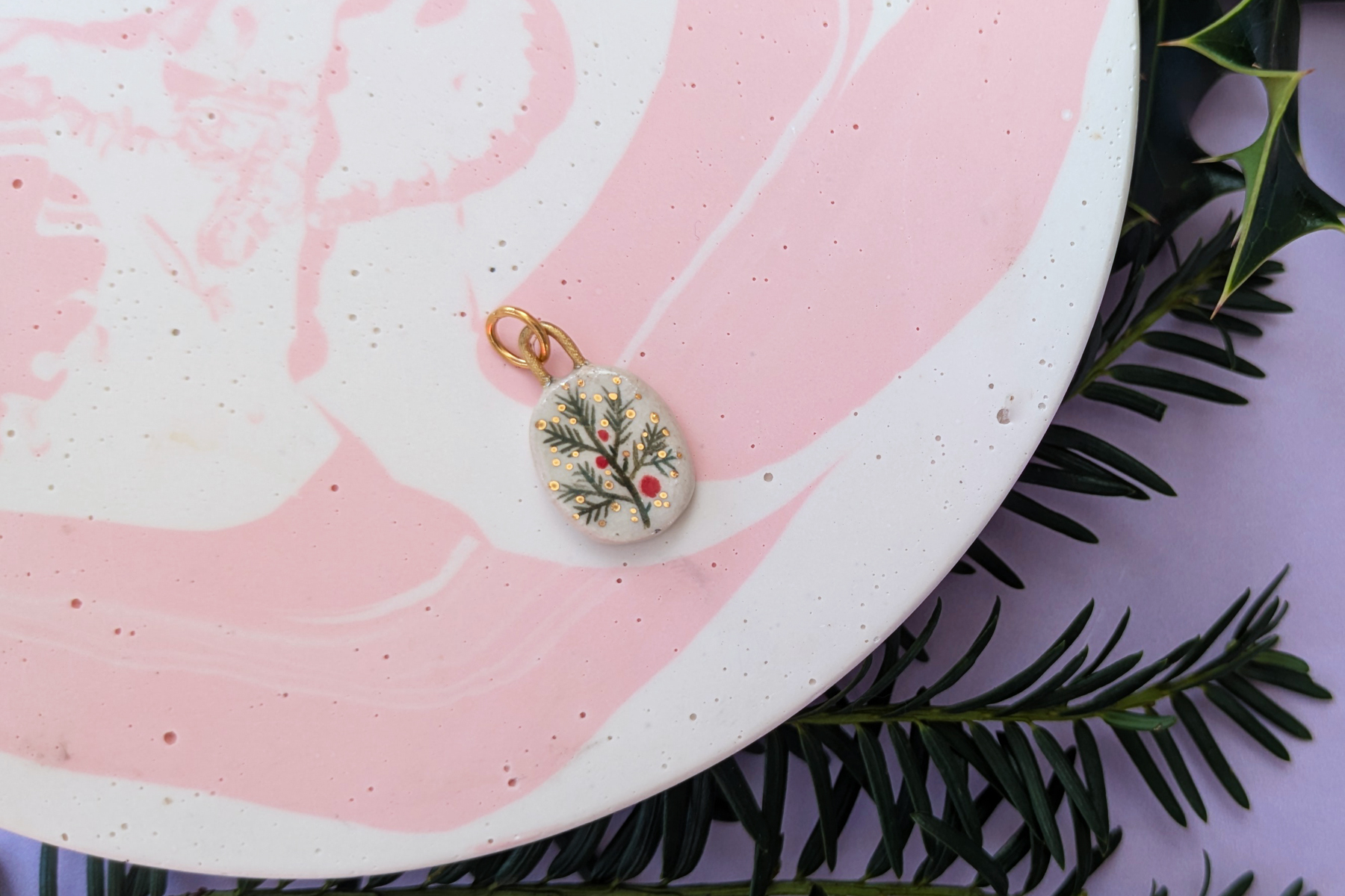 A hand-made little pendant, made from stoneware clay and intricately hand-painted with underglaze, each pendant is finished with a glossy ceramic glaze and 24kt gold lustre details.