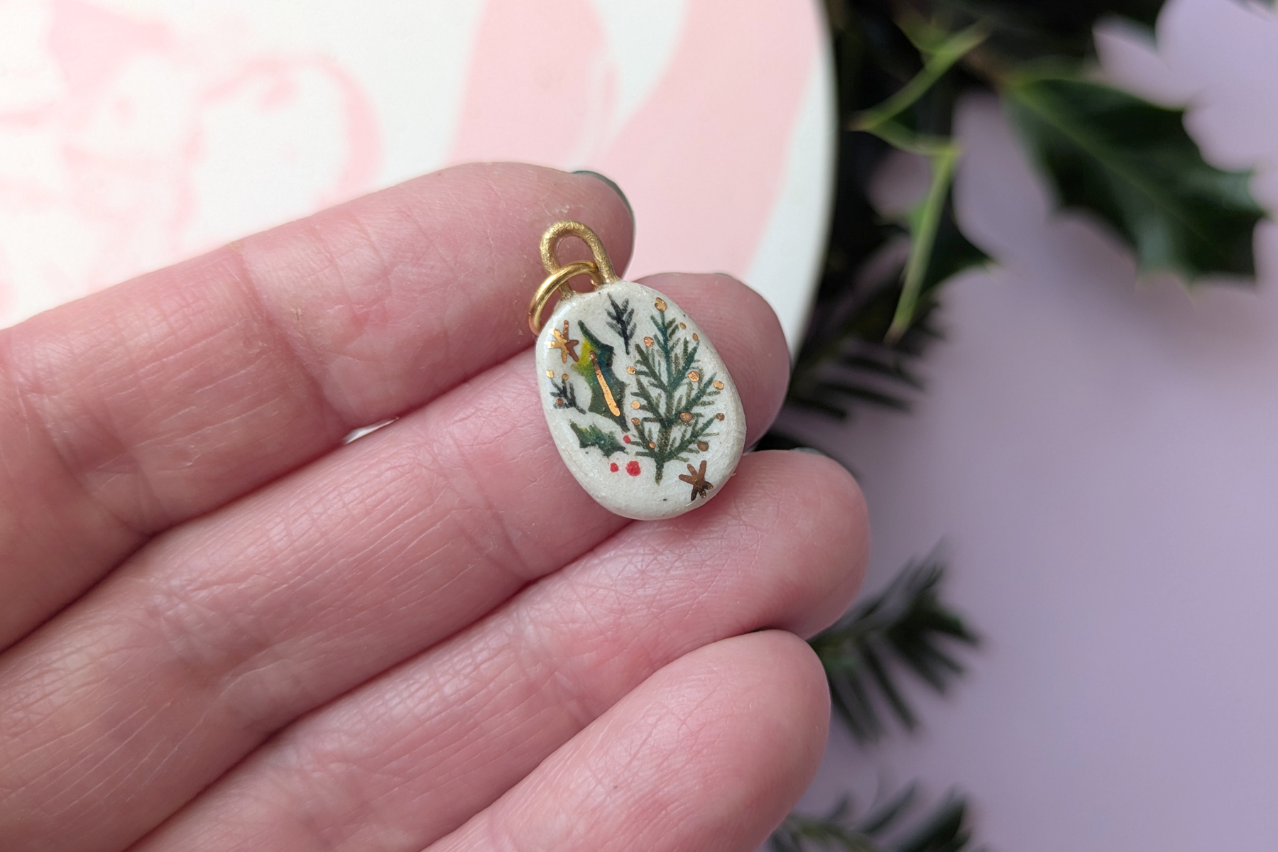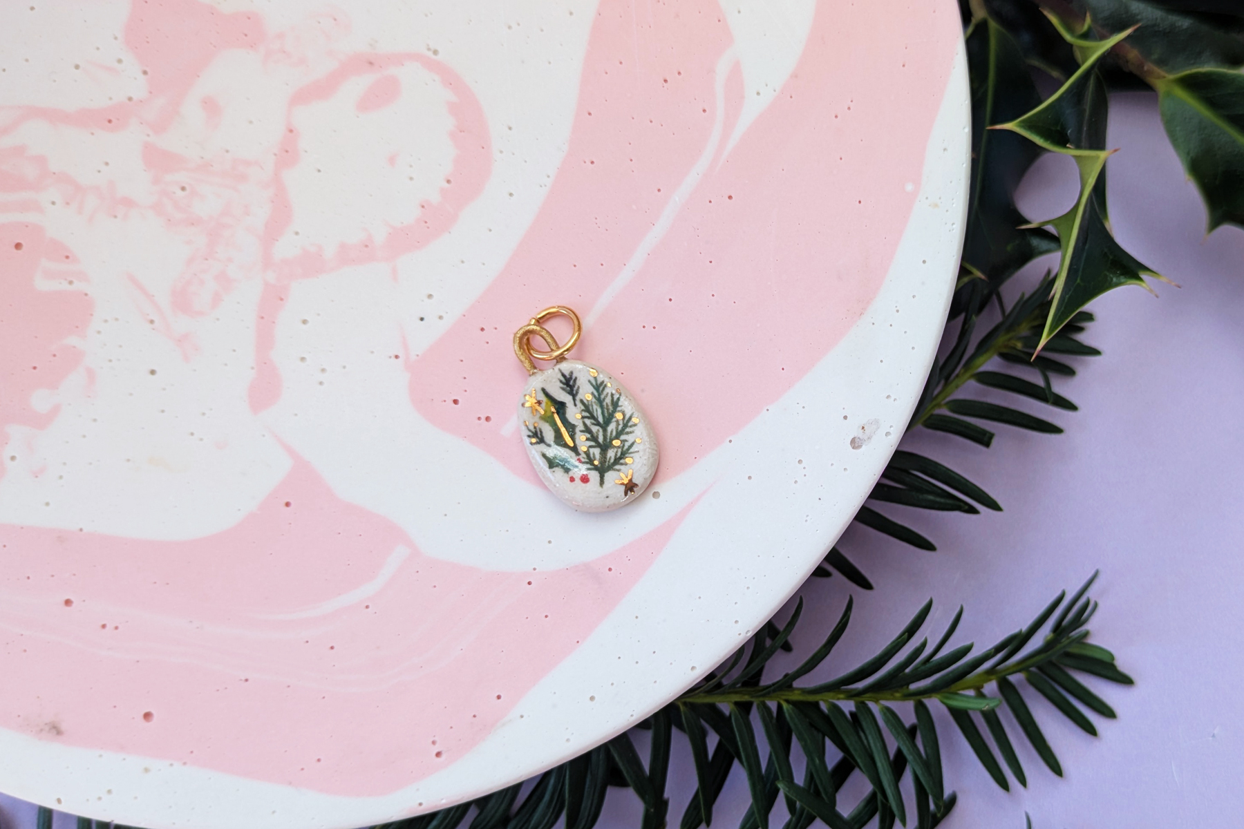 A hand-made little pendant, made from stoneware clay and intricately hand-painted with underglaze, each pendant is finished with a glossy ceramic glaze and 24kt gold lustre details.