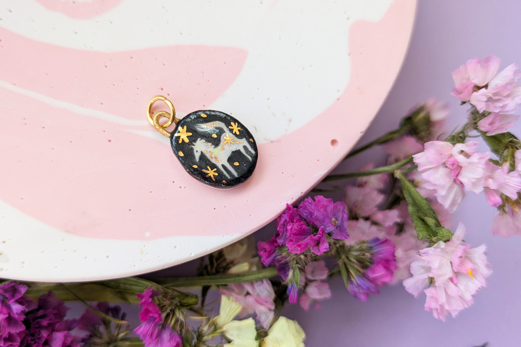 A hand-made little pendant, made from stoneware clay and intricately hand-painted with underglaze, each pendant is finished with a glossy ceramic glaze and 24kt gold lustre details.