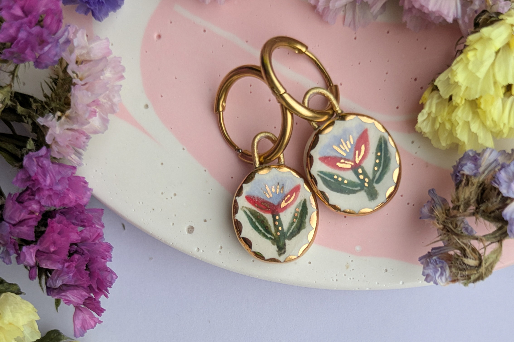 Ceramic Pendant Earrings: Folk Floral Blooms