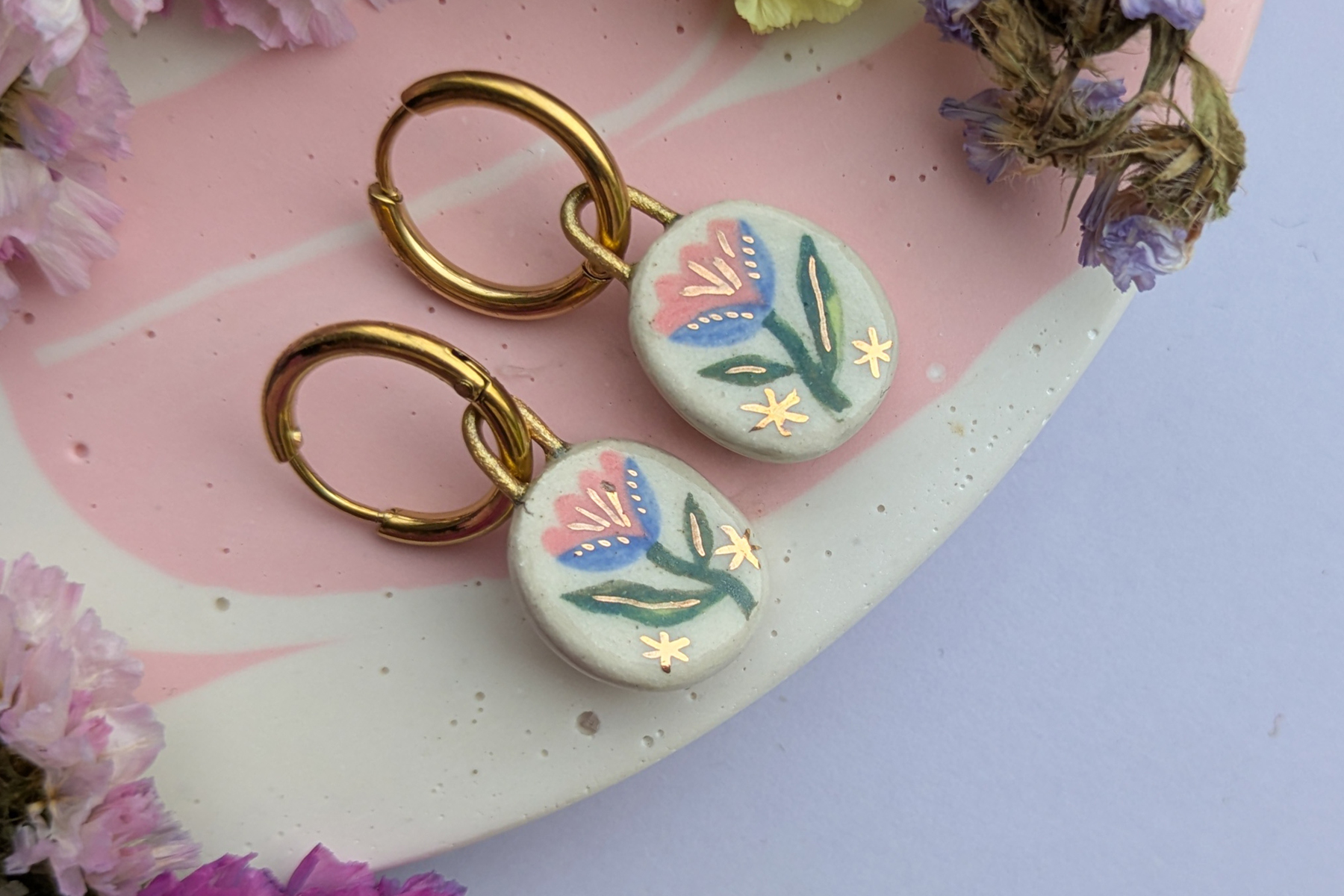 Hand-made little pendants, made from stoneware clay and intricately hand-painted with underglaze, each pendant is finished with a glossy ceramic glaze and 24kt gold lustre details. Hung from ion-plated stainless steel huggie-style hoops with surgical stainless steel pin (the bit that goes through the ear!)