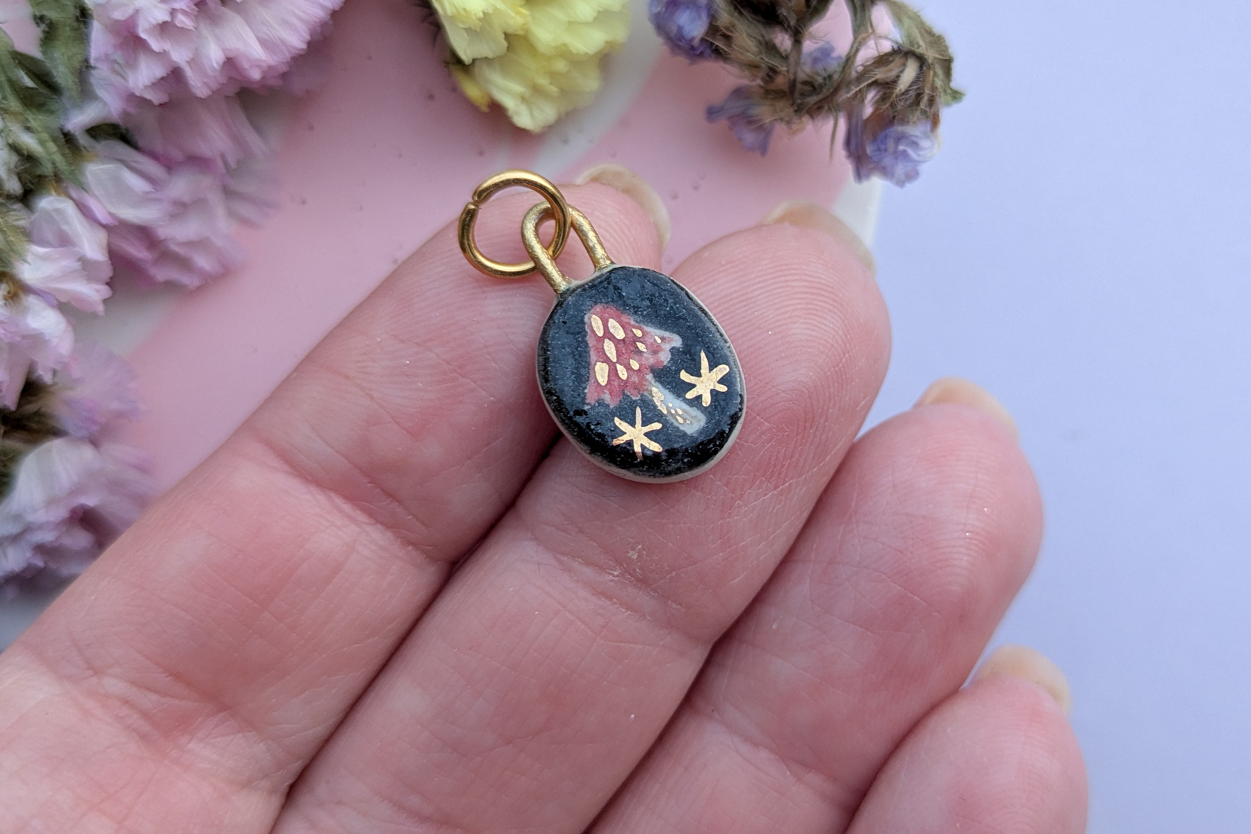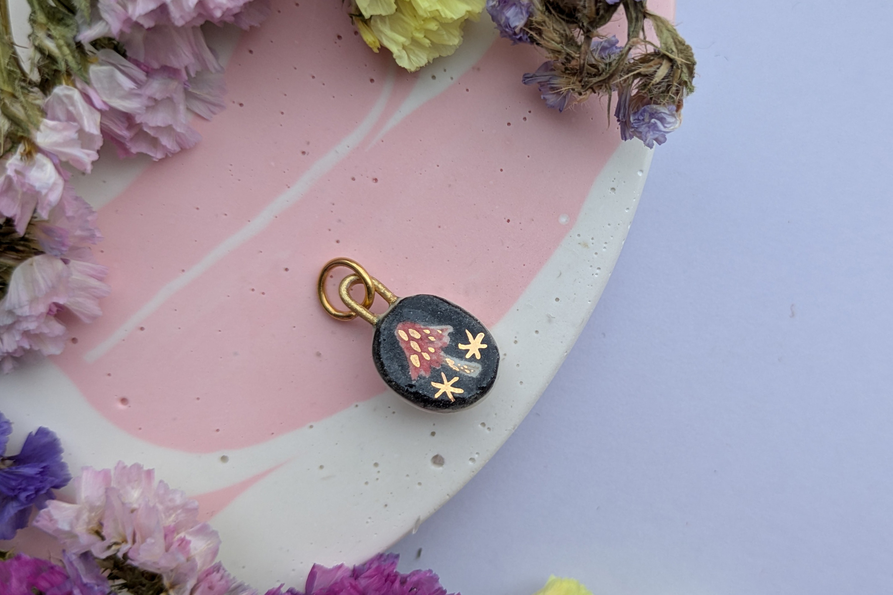 A hand-made little pendant, made from stoneware clay and intricately hand-painted with underglaze, each pendant is finished with a glossy ceramic glaze and 24kt gold lustre details.