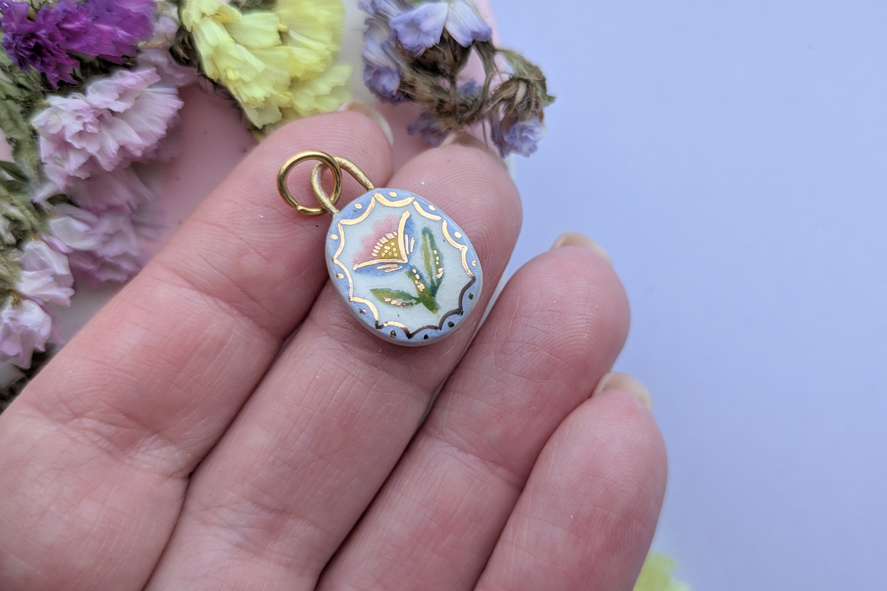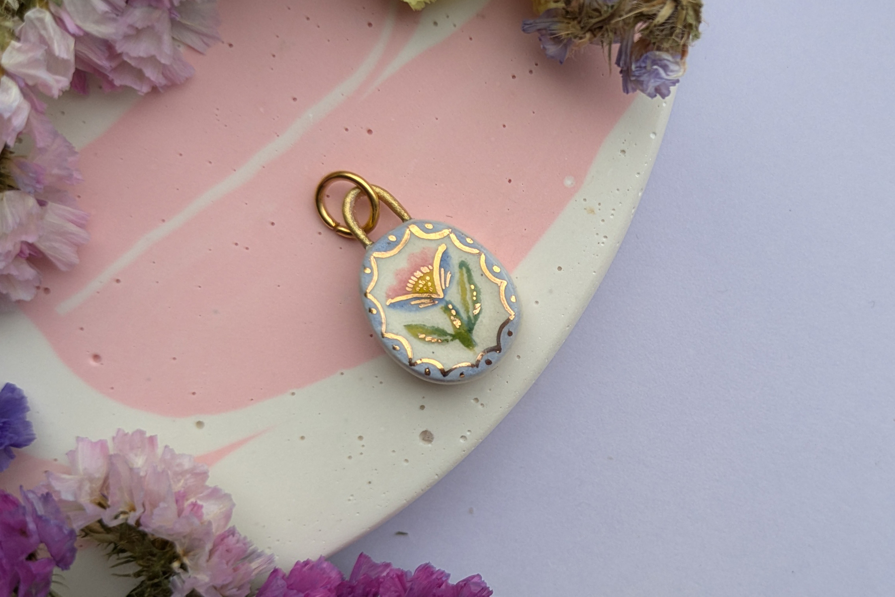 A hand-made little pendant, made from stoneware clay and intricately hand-painted with underglaze, each pendant is finished with a glossy ceramic glaze and 24kt gold lustre details.