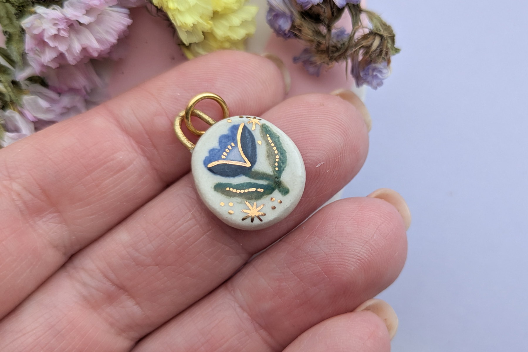 A hand-made little pendant, made from stoneware clay and intricately hand-painted with underglaze, each pendant is finished with a glossy ceramic glaze and 24kt gold lustre details.