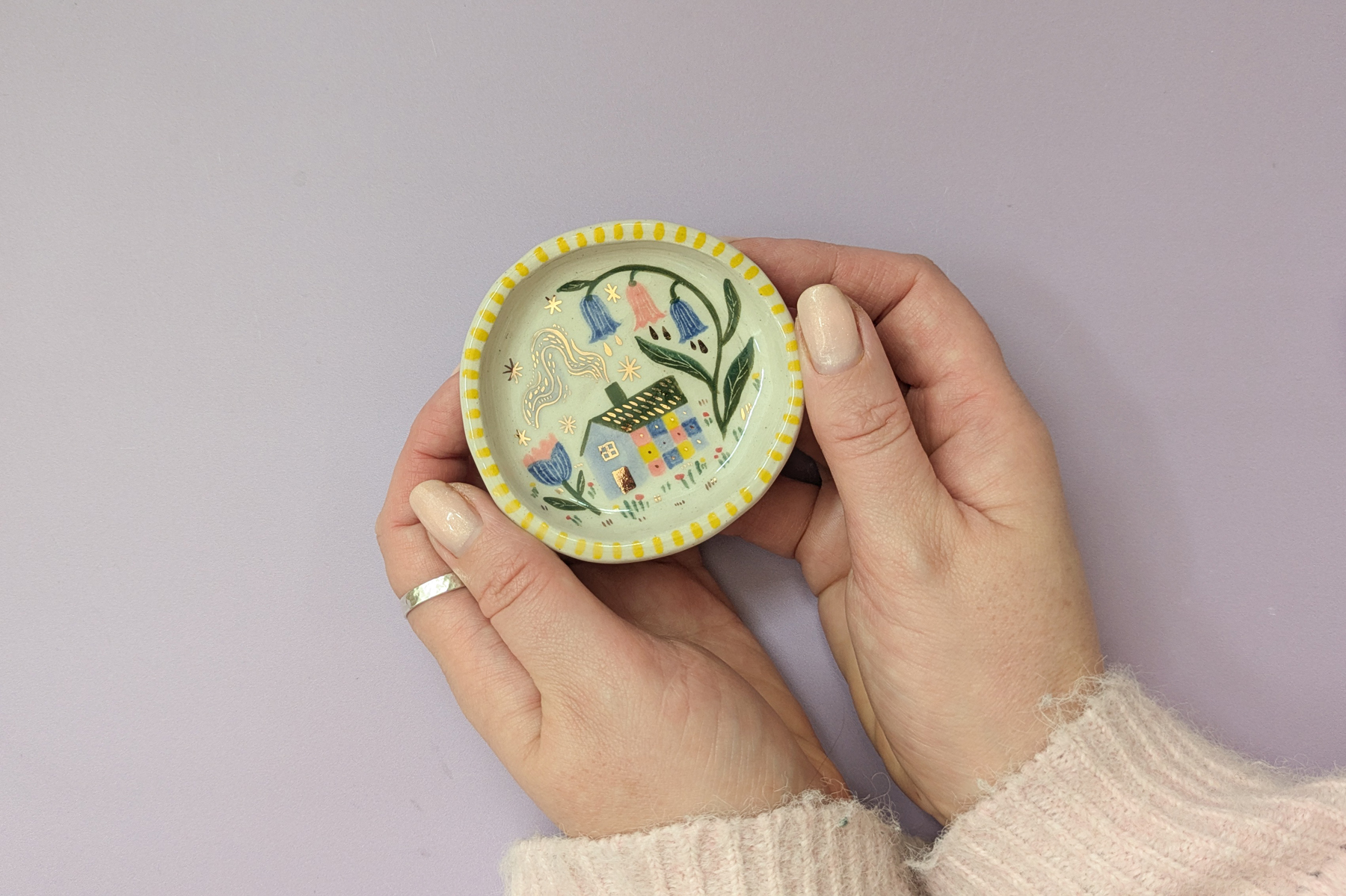 This is a hand-built slab made, slightly wobbly, dish. Handpainted and finished with a glossy glaze and 24kt gold lustre details. Use it to store jewellery items, or as a tealight/incense holder.