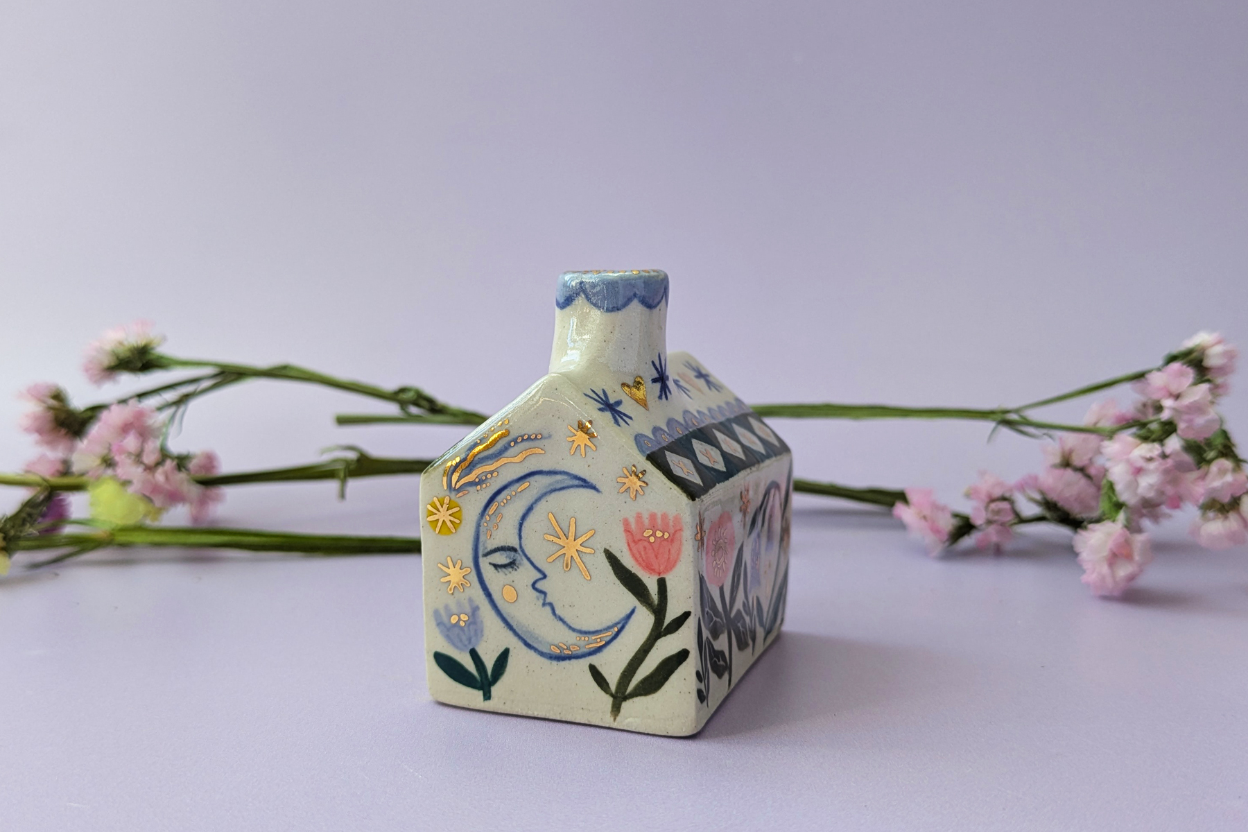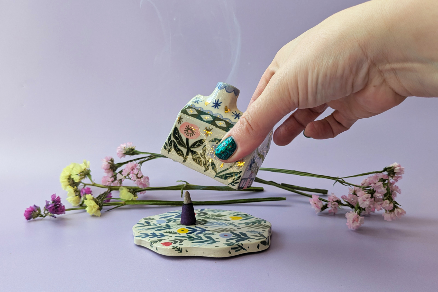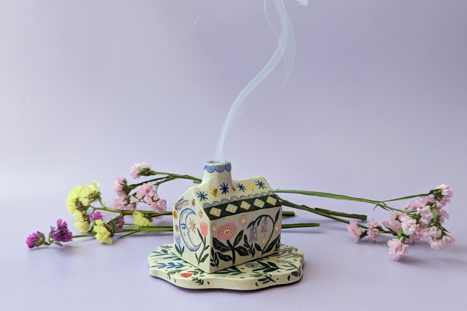 A cottage style incense burner – pop a cone on the garden base, light it and place the house over the top and watch the smoke unfurl from the chimney! This set comes with a a small metal disc you can place under the lit cone to protect the ceramic base. When not using for incense, you can place dried flowers in the chimney to turn it into a cute little vase!