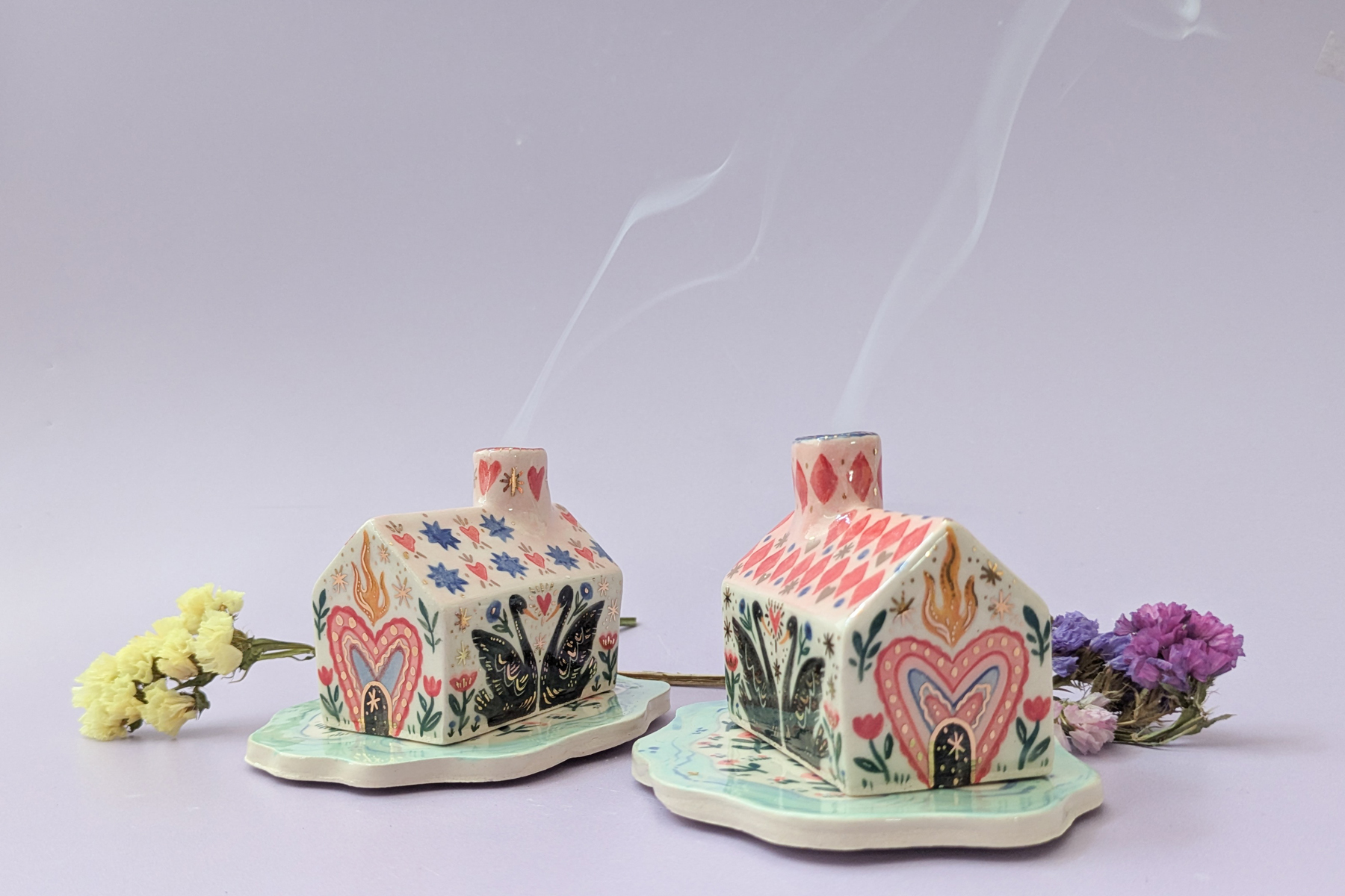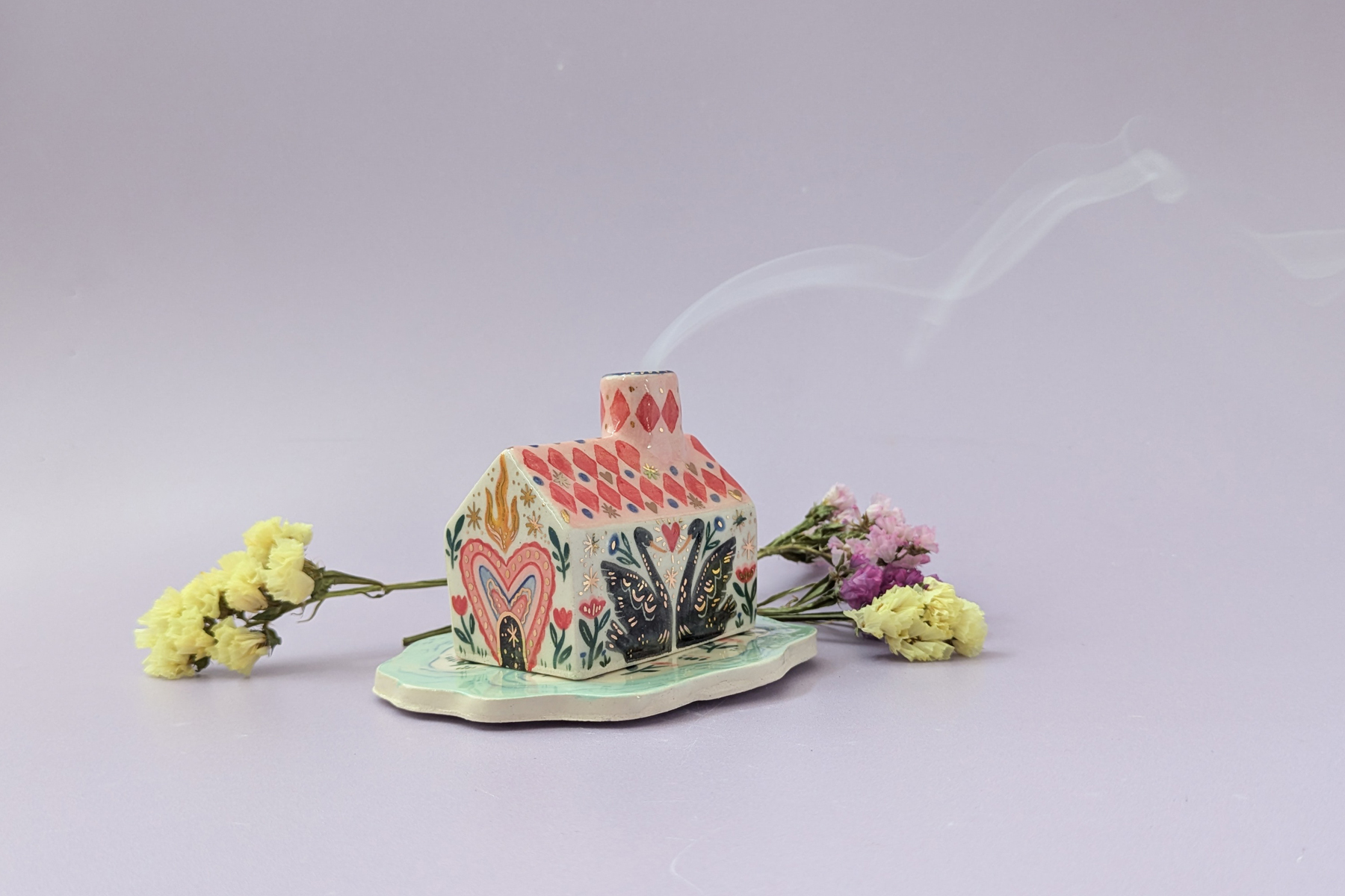 A cottage style incense burner – pop a cone on the garden base, light it and place the house over the top and watch the smoke unfurl from the chimney! This set comes with a a small metal disc you can place under the lit cone to protect the ceramic base. When not using for incense, you can place dried flowers in the chimney to turn it into a cute little vase!