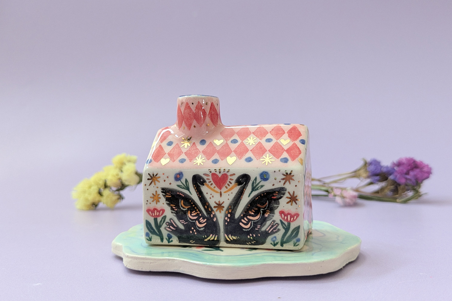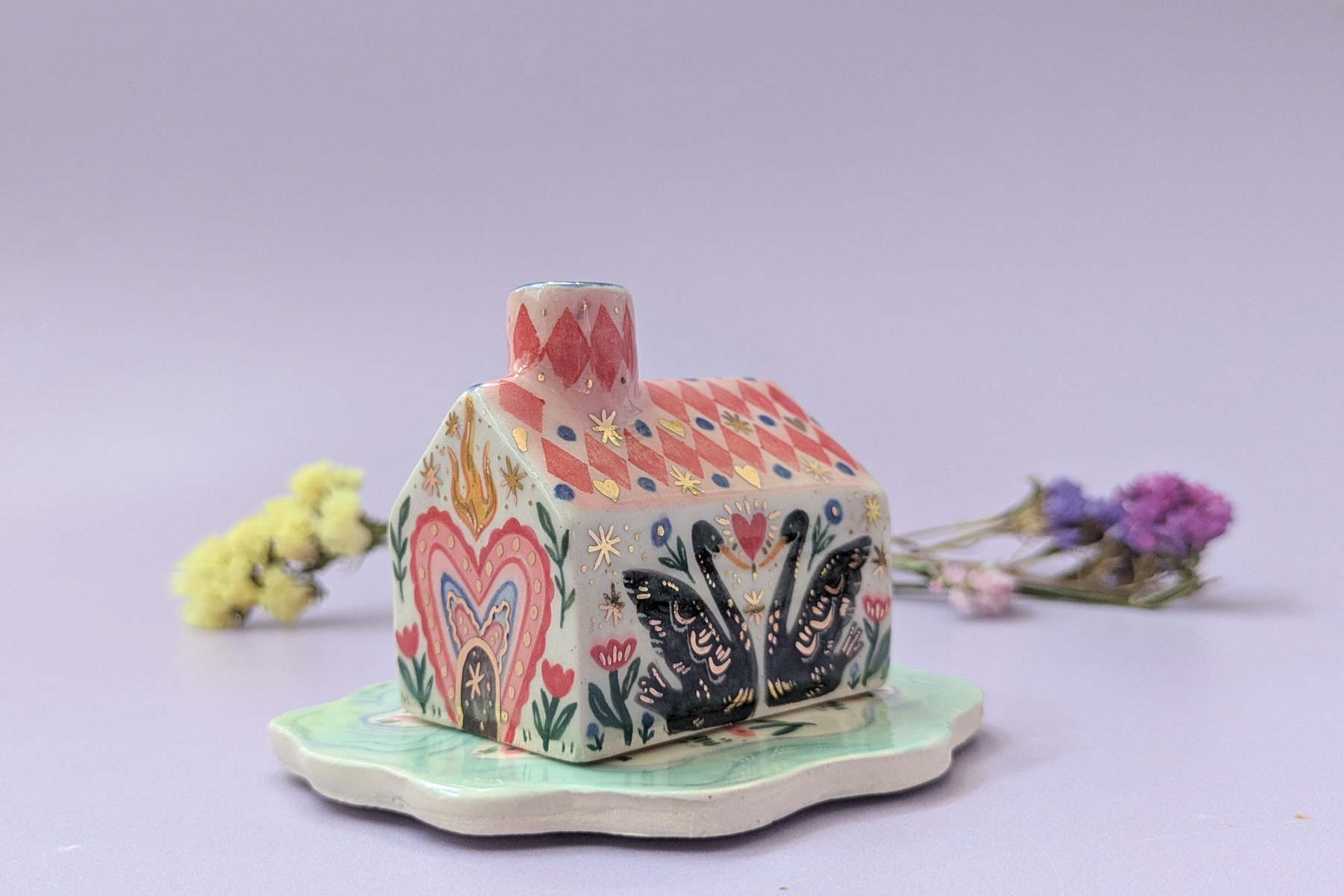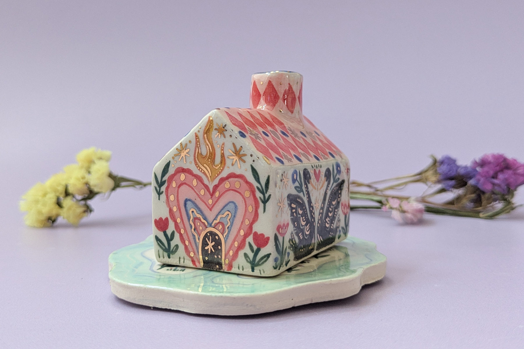 This listing is for the pink and red coloured roofs. Please note that some of the small design details may vary across the pieces, this is partly because these are handpainted, and partly because of the minor variations in size across the collection and how much surface area there was to decorate on.