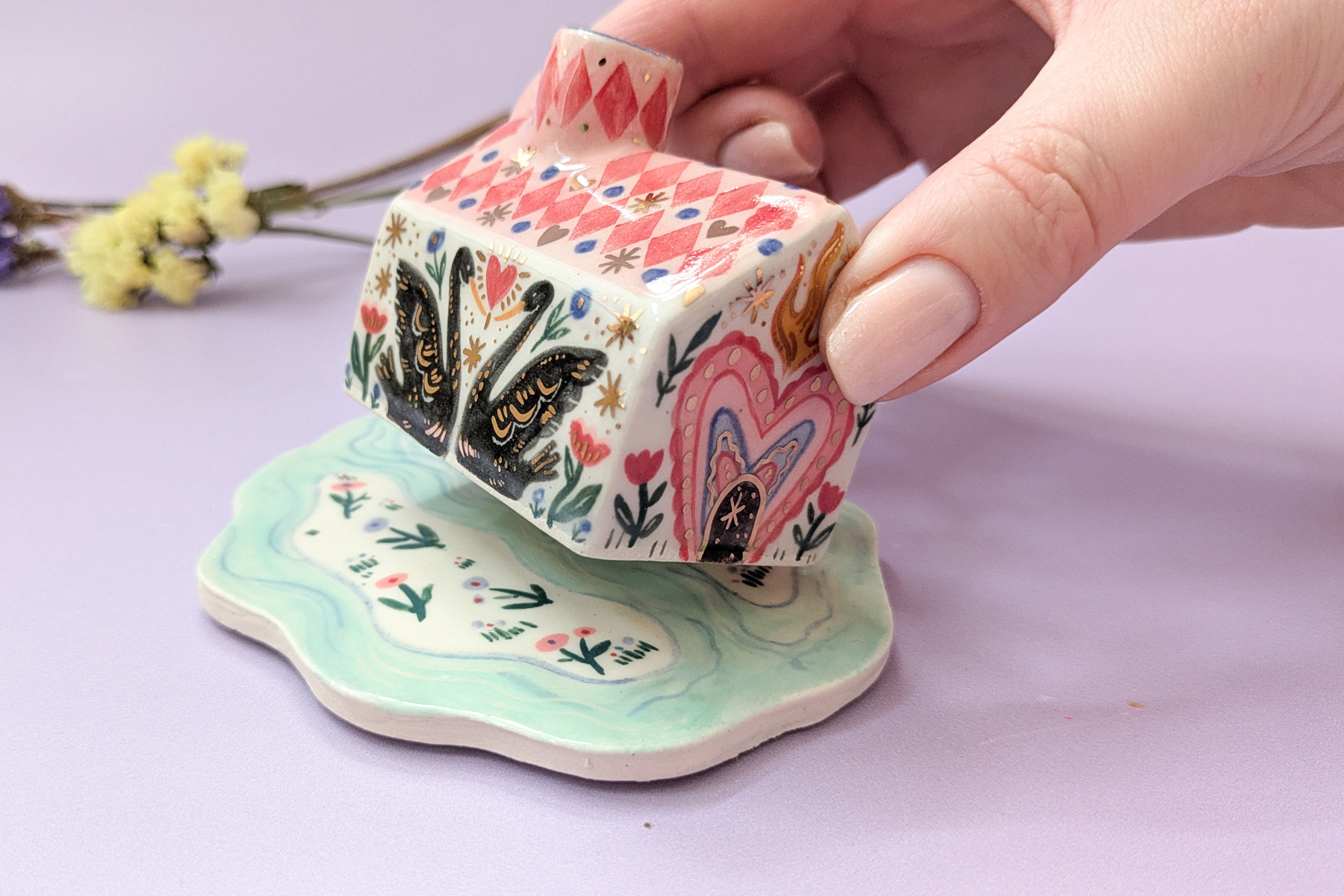 Note that this is a hand-made, hand-painted ceramic item and as such, there may be slight imperfections, minor surface cracks, a touch of wobbliness, visible brushstrokes, or subtle variations in depth of colour. With the cottage bases, there may be some where the edges are slightly raised upwards rather than laying completely flat, each one has silicone pads n the bottom for stability. This is all part of the charm and joy of a handmade artisan item!