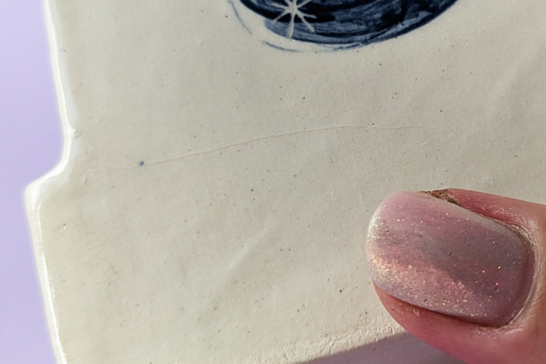 - This piece has a very fine surface crack along the glaze finish on the front and back.