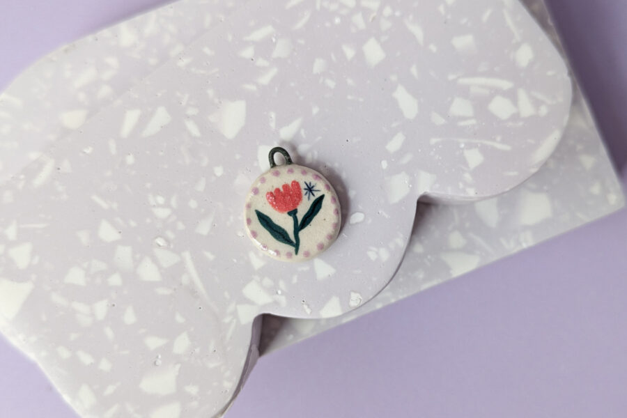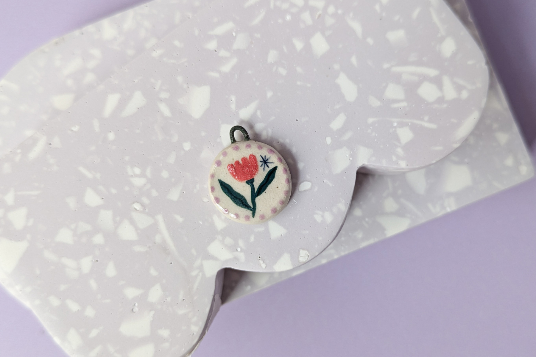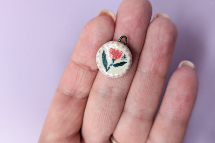 - This was from my first batch of pendants – unfortunately some of the underglaze bubbled in the firing process. Pendant is still wearable. Price reflects the defects of the glaze.