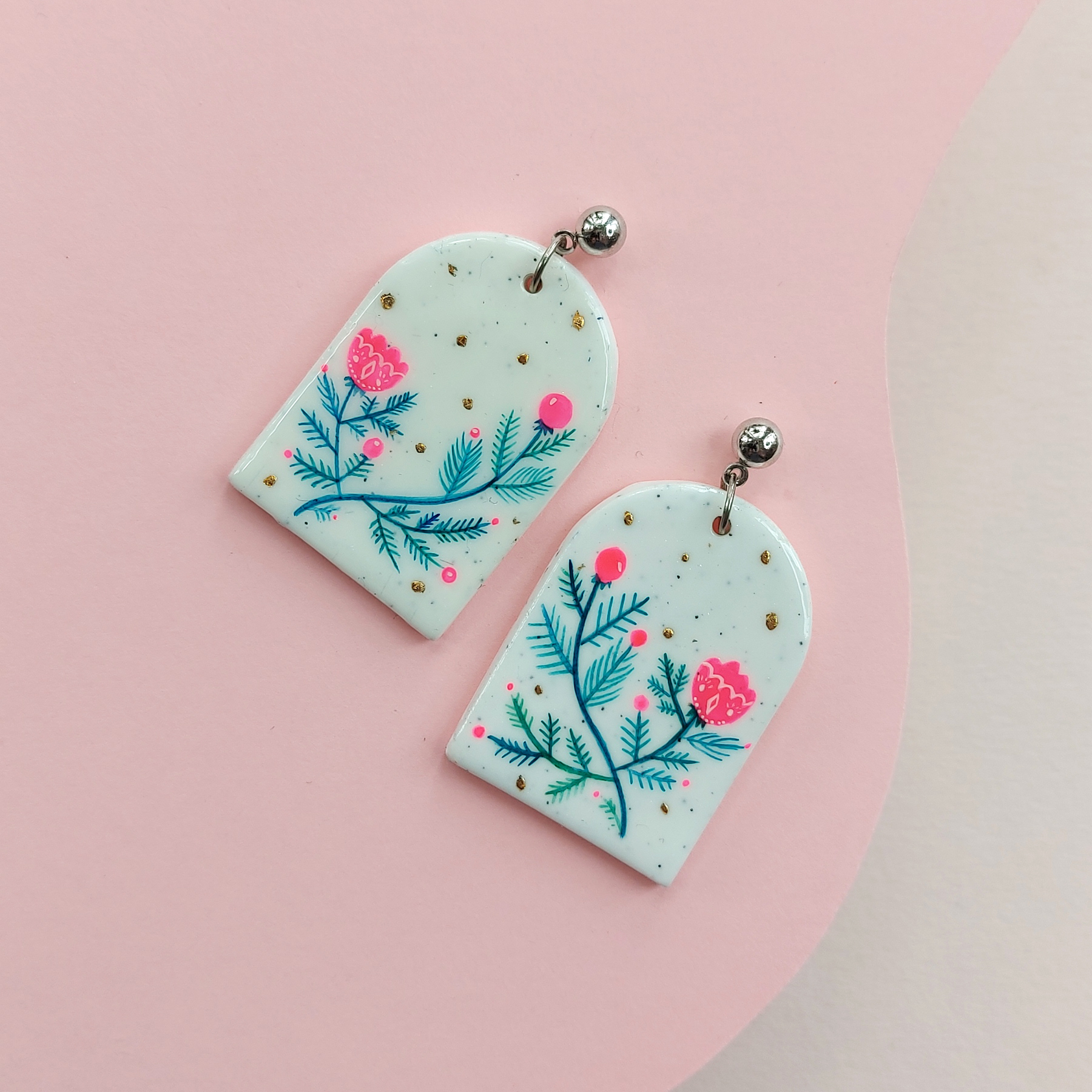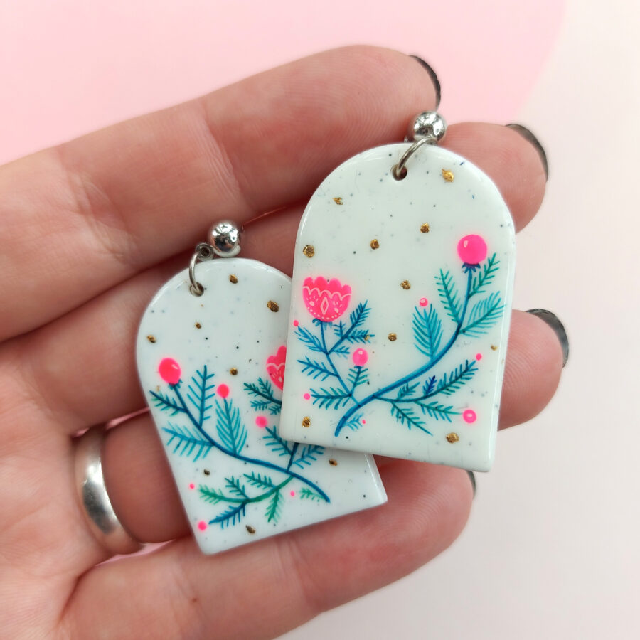 Hand painted christmas floral earrings, white polymer clay with pops of bright green, blue and pink and gold leaf.