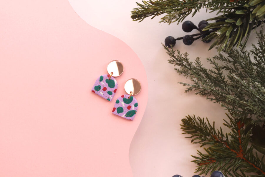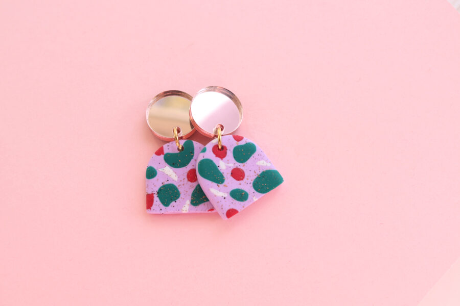 Little lilac arches with flecks of red, green and white, attached to rose gold mirrored studs